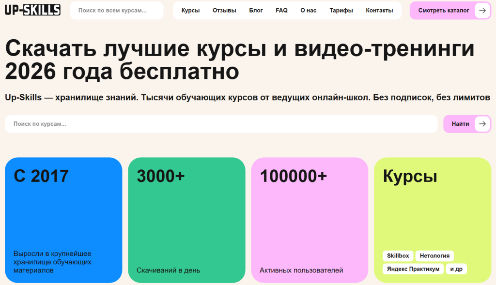 На сегодняшний день в базе платформы находится более 60 000 обучающих материалов и курсов, распределенных по десяткам тематических категорий. Каталог постоянно обновляется, поэтому точное число программ со временем меняется. Сегодня Up Skills представляет собой крупную библиотеку онлайн-обучения, где собраны десятки тысяч образовательных программ. Пользователи уже выбирают курсы из разных сфер: от IT и маркетинга до здоровья, бизнеса и языков. Можно скачать любой курс бесплатно уже сейчас!