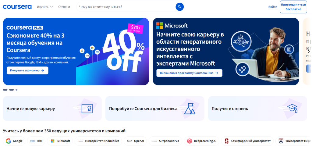 Coursera остается одной из крупнейших образовательных платформ мира. Здесь представлены программы университетов и крупных компаний. Среди партнеров: Stanford, Google, IBM, Meta*