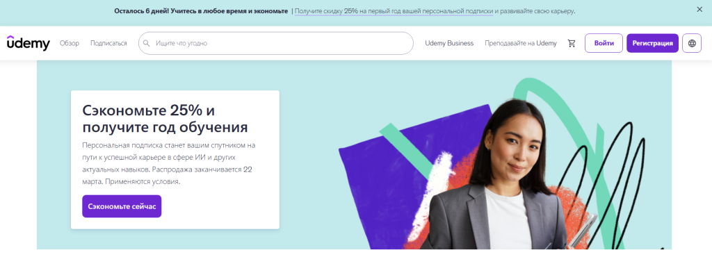 Udemy работает как огромный маркетплейс курсов. Здесь более 200 тысяч образовательных программ. Платформа, которая громко заявляет о доступности образования, но на деле скорее разочаровывает. Главная проблема — отсутствие контроля качества: здесь соседствуют достойные курсы и откровенно слабые материалы от неквалифицированных авторов. Платформа прямо снимает с себя ответственность за содержание обучения — то есть вы платите, по сути, на свой страх и риск. К тому же многие программы быстро устаревают (особенно в IT‑сфере), но продолжают продаваться по высокой цене, будто содержат актуальные знания.