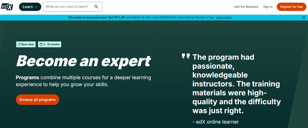 Платформа университетского уровня. Несмотря на наличие бесплатных опций (unverified‑курсы), реальная ценность edX раскрывается только при покупке verified‑версии или полноценных академических программ — а их цена может оказаться неподъёмной для многих желающих учиться.