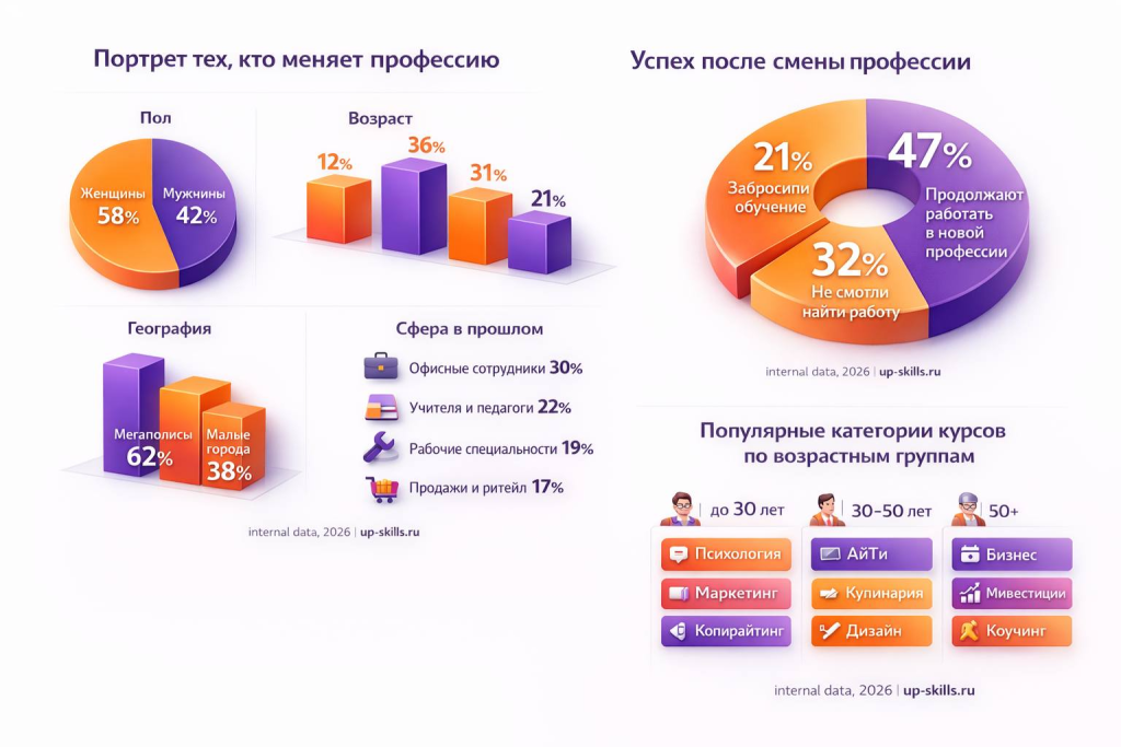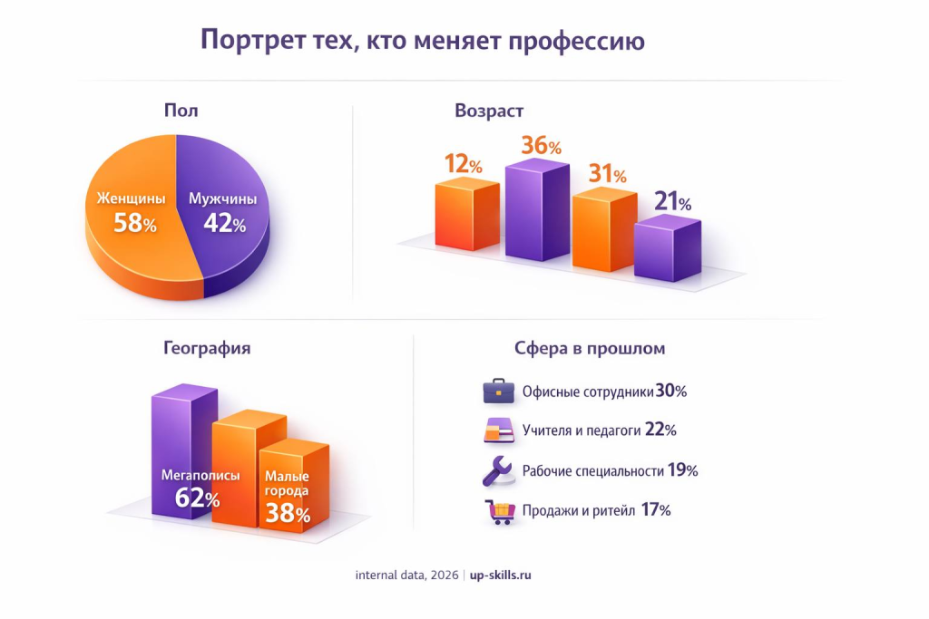 Женщины чуть чаще идут в смену профессии. И это не про «моду на курсы», а про гибкость. Они быстрее адаптируются, чаще готовы учиться заново и легче принимают позицию новичка.