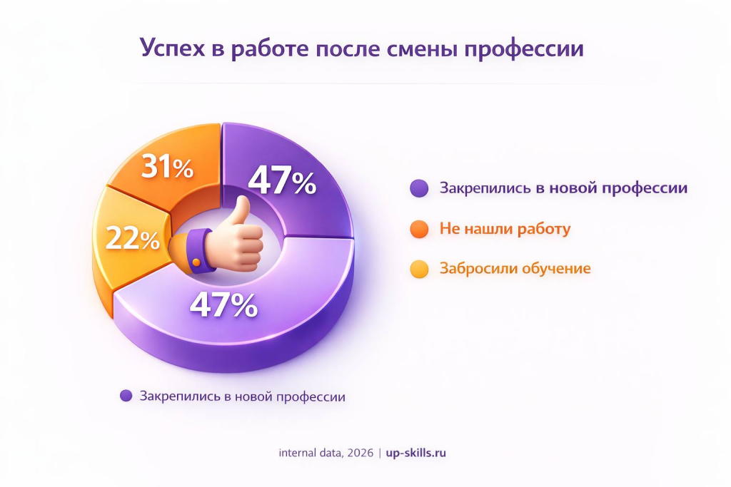 Но важно понять курсы не делают тебя специалистом, они дают тебе шанс им стать. Почти половина реально закрепляется в новой профессии. Это сильный показатель, но есть нюанс,